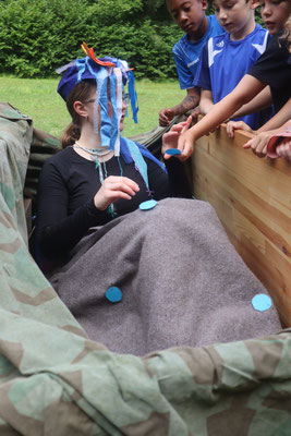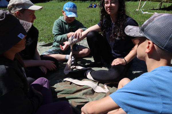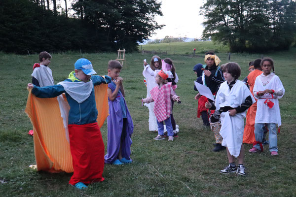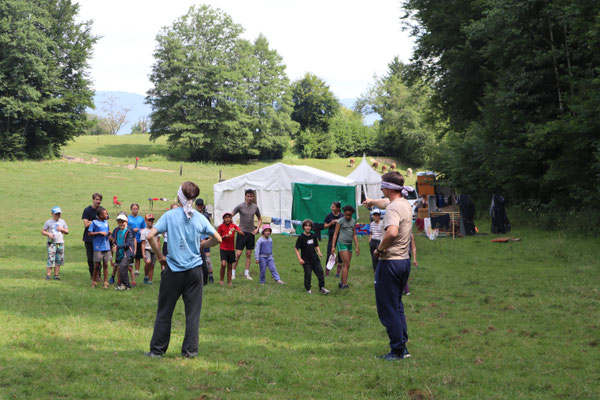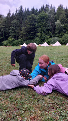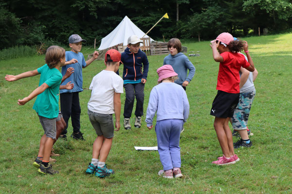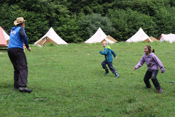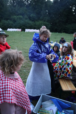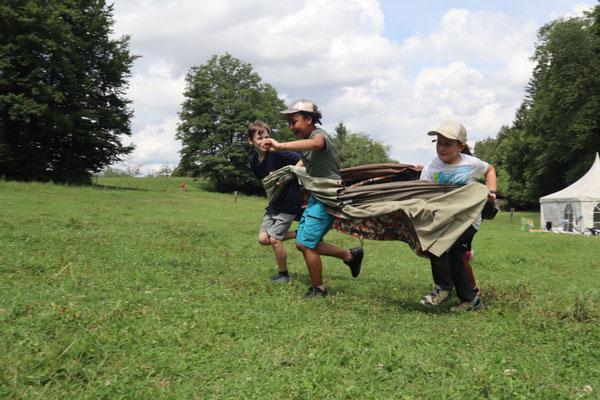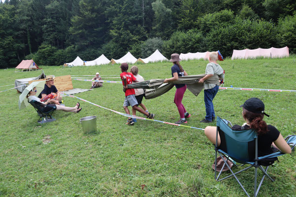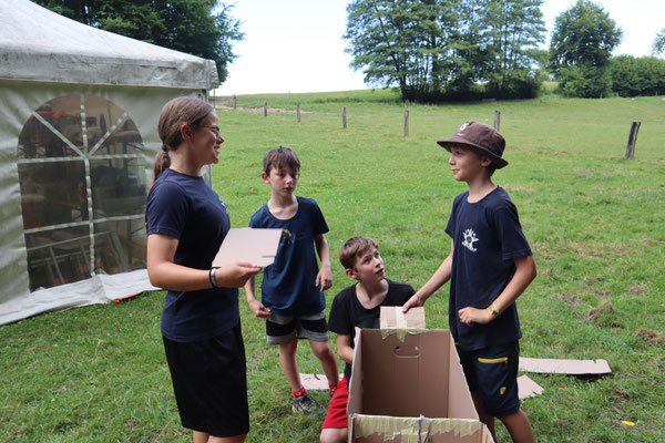 Am Montag ging es los. Gemütlich trafen wir uns beim Gemeindehaus in Luterbach, um uns auf den Weg zu machen. Da kam die Post vorbei und bat uns um Hilfe, erfinde die eine Adresse und den Empfänger nirgends. Wir beschliessen dem armen Pöstler zu helfen und gehen mit ihm. Bei der Adresse angekommen, fanden wir nur ein komisches Portal. Unsere Neugier packte uns und wir gingen hindurch und landeten in der ungewissen Welt von Robin Hood, der uns kurz darauf bereits in Empfang nahm. Gemeinsam stellten wir verschiedene Blachenbauten, bevor uns Robin Hood weiterhelfen konnte. Nach einem feinen Znacht, wurden dann gemeinsam noch Briefkästen gebaut, dass die Kommunikation auch sichergestellt ist.