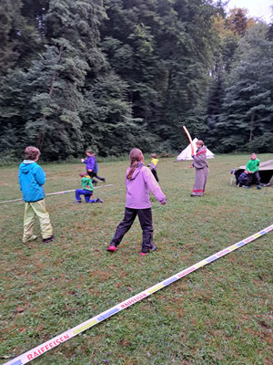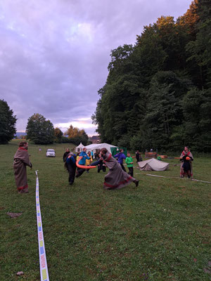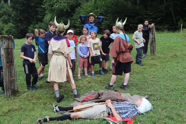 Da wir gestern Abend die Karte vom Aufenthaltsort von Heiner Pfundkom zurückbekommen haben, konnten wir ihn auffinden. Das ganze haben wir in einem Geländespiel gemacht. Das Meer musste gereinigt werden, dass wir ihn retten konnten. Doch dann sind wir von zwei Wikinger aufgehalten worden. So haben wir nach einer Stärkung Heiner befreit, er wurde von dem Wikinger verzaubert, also mussten wir ihn mit einem Zauberspruch retten. Nachdem wir ihn retten konnten, haben wir Znacht gegessen und haben den Abend entspannt ausklingen lassen während wir unsere neuen Freundschaftsbücher ausfüllten und später noch Laternen steigen liesen.